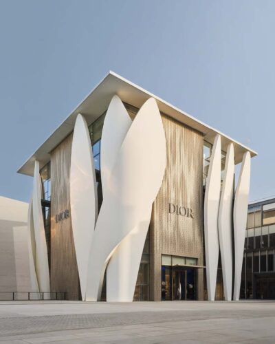 A fachada é revestida por formas que lembram pétalas. Elas criam a sensação de movimento, como se fossem tecidos ao vento, uma referência direta ao famoso New Look criado por Christian Dior. Detalhes em vidro dourado, feitos à mão, reforçam a ligação com a cultura chinesa, onde o dourado simboliza nobreza e tradição.
