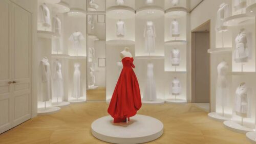 A House of Dior Beijing reúne todo o universo da marca: moda feminina e masculina, bolsas, acessórios, calçados, perfumes, joias, relógios e objetos de decoração. Entre tantas peças, um vestido de baile vermelho se destaca, representando a “cor da vida”, como dizia o próprio Christian Dior.