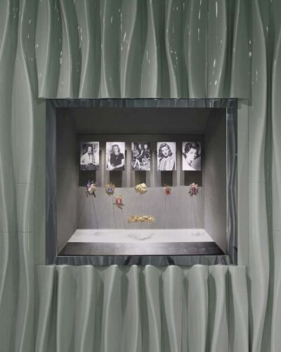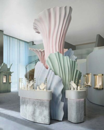 Logo na entrada da exposição, uma instalação inspirada em conchas transporta os visitantes para o fundo do mar. Com formas curvas e orgânicas, a estrutura cria um ambiente imersivo, ideal para apresentar uma coleção que é ao mesmo tempo sofisticada e cheia de significado.